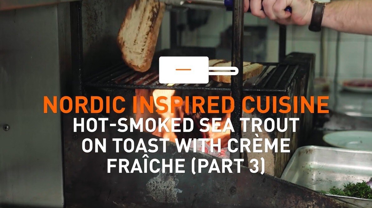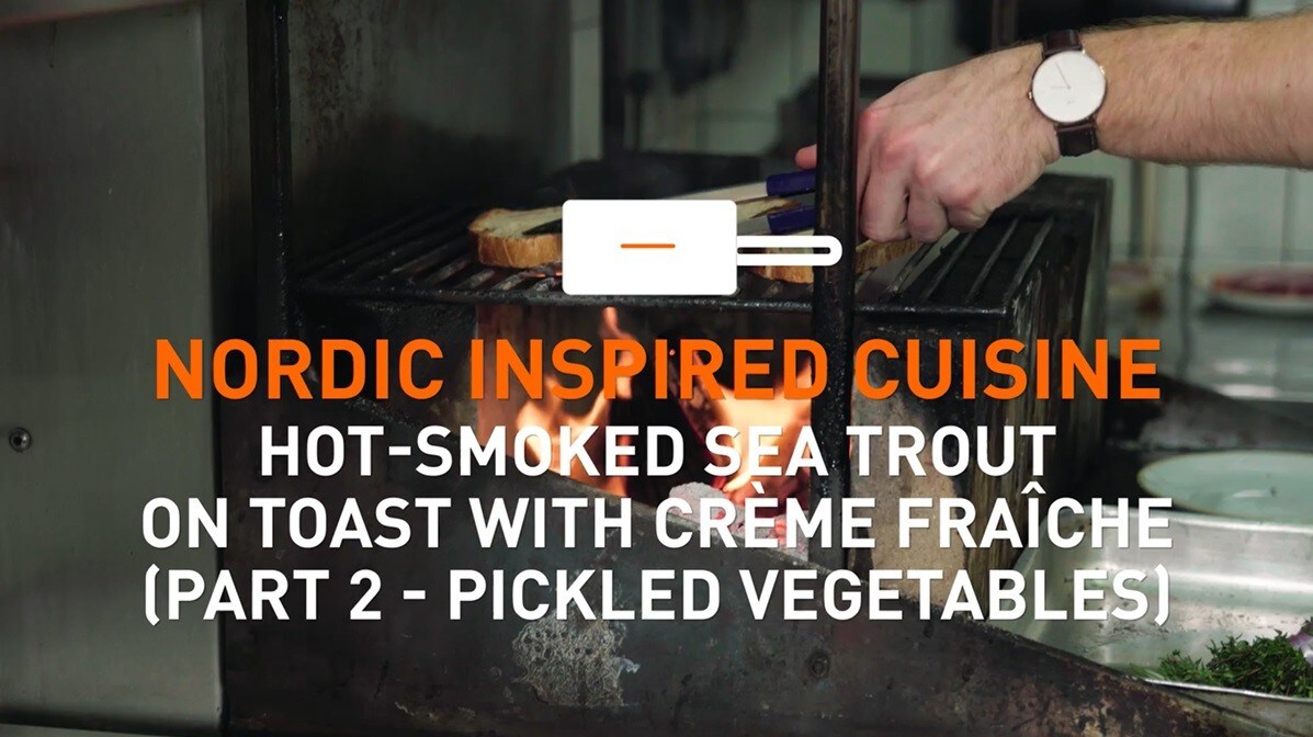 Watch part 2 to perfect the assembly of this Norwegian inspired sandwich. Watch as creme fraiche is paired with an assortment of pickled vegetables and ripples of smoked trout.