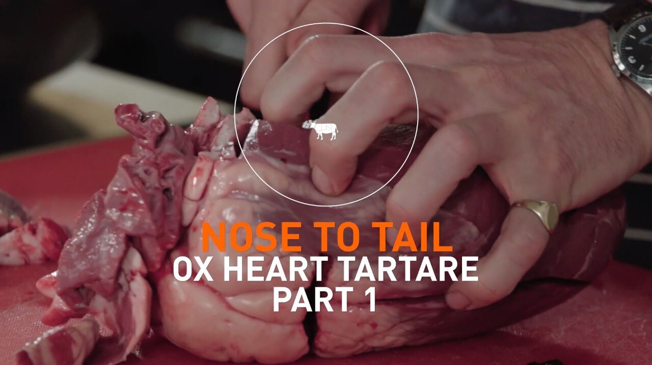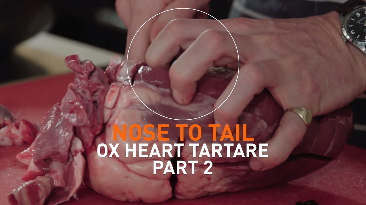Move onto the heart tartare, prepping and slicing the ox heart into small chunks before learning the recipe for the tartare seasoning used in Part 2.