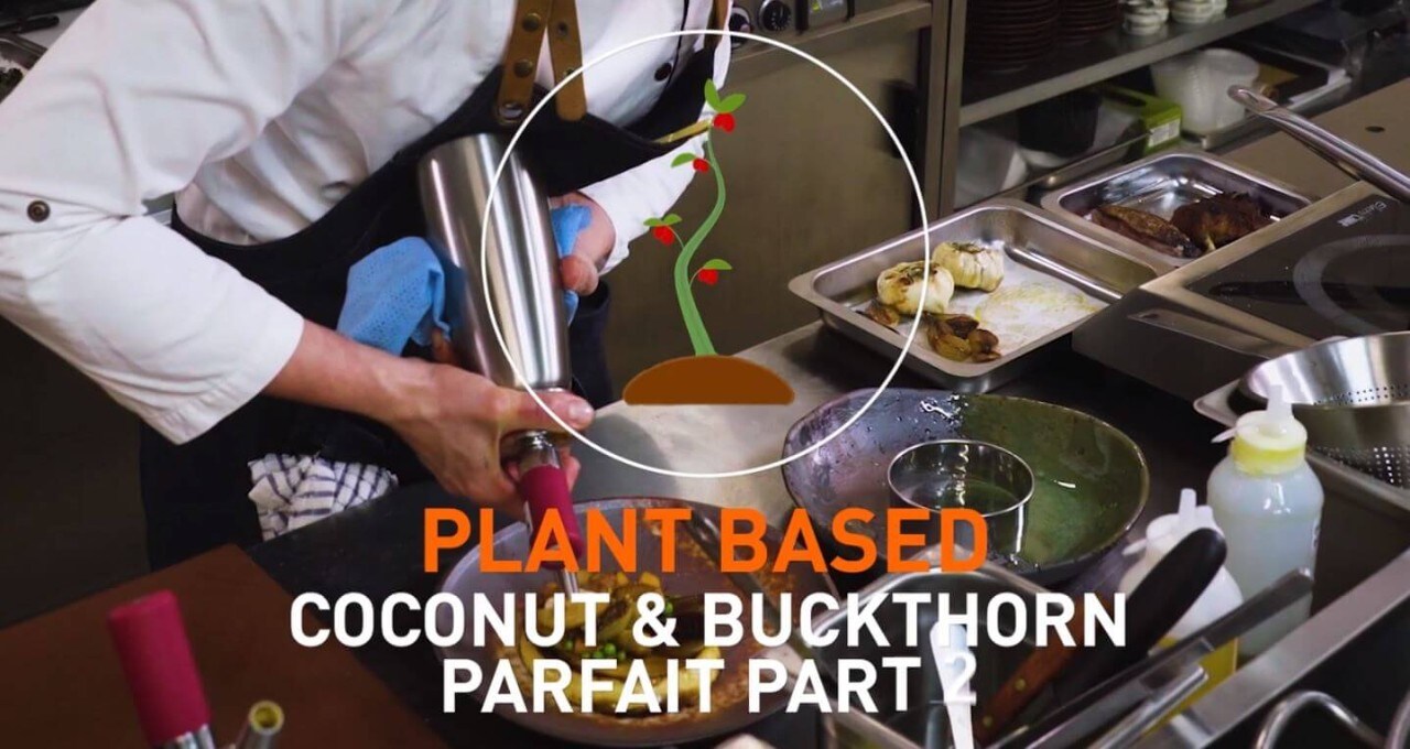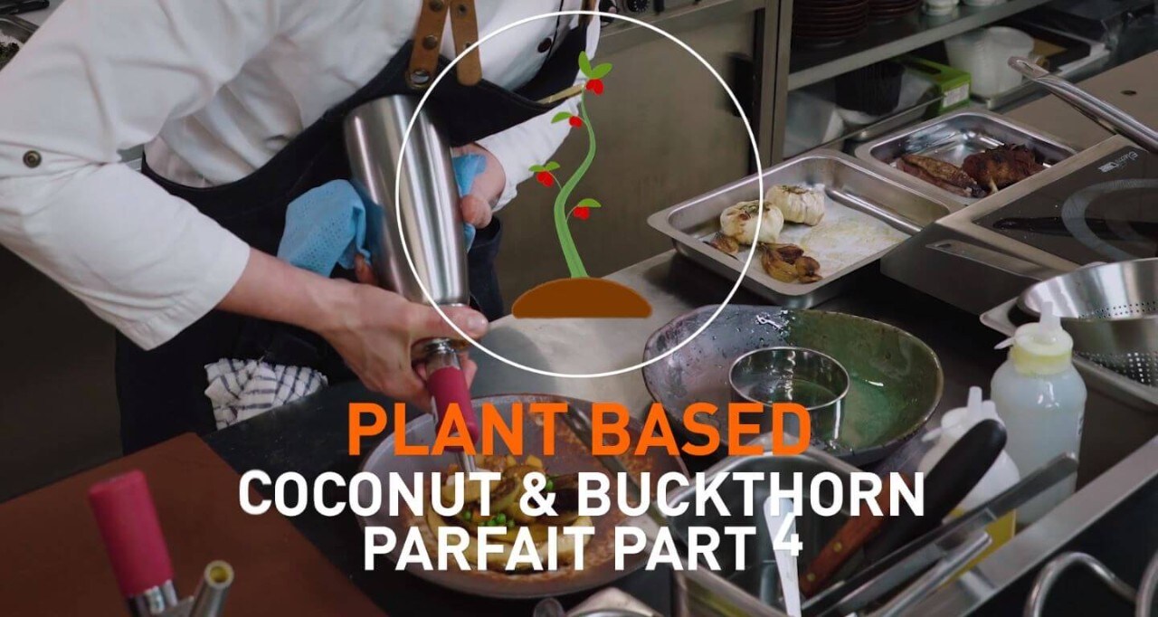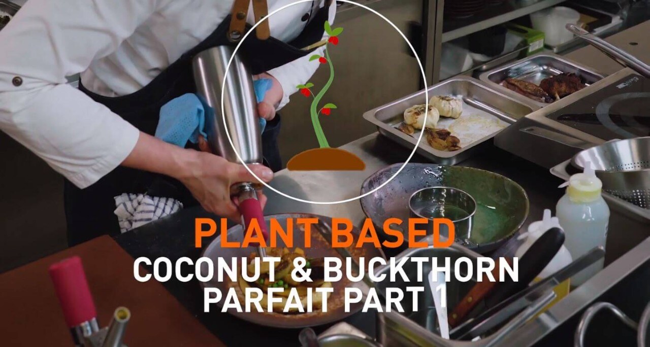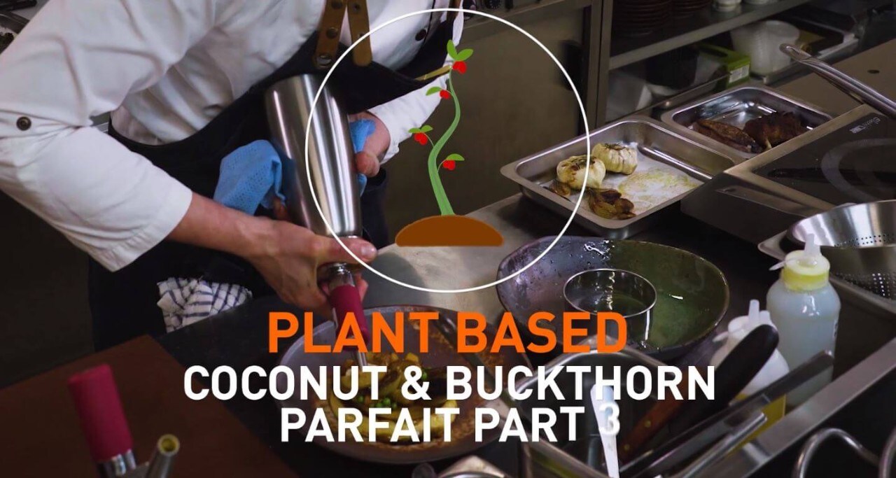 Combine sea buckthorn puree and kumbuat jam before cooking, heating then cooling and freezing creating coconut parfaits.