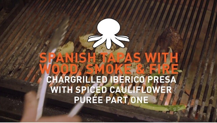 Watch how to perfectly cook Iberico pork presa on the robata grill, before plating up with spiced cauliflower puree and chargrilled cauliflower florets.