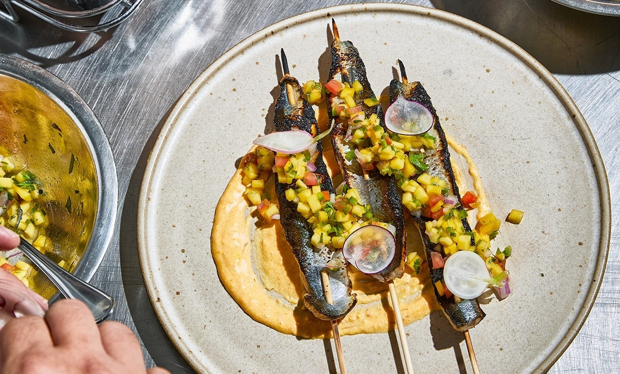 Flame Broiled Skewered Herring w/ Mango Pico & Rouille